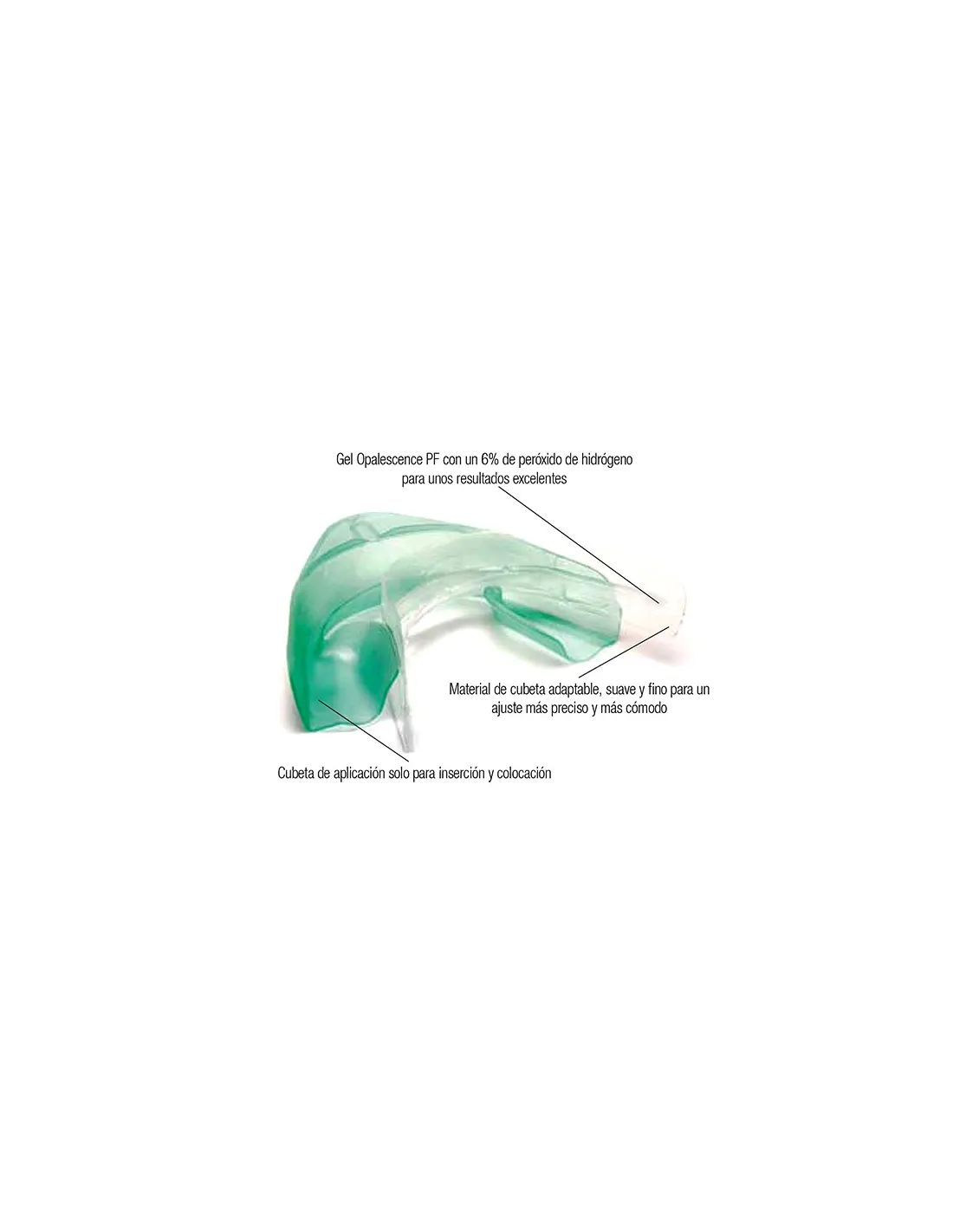 El gel de blanqueamiento Opalescence Go 6% contiene nitrato de potasio y fluoruro para reducir la sensibilidad y proteger contra la caries. Además, el material de las cubetas es fino y muy confortable para el paciente.
