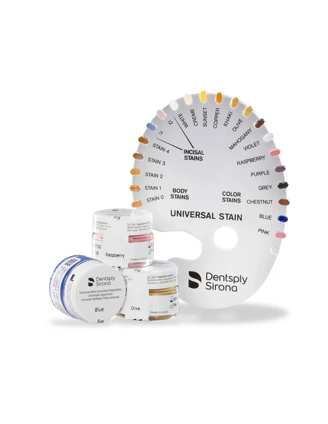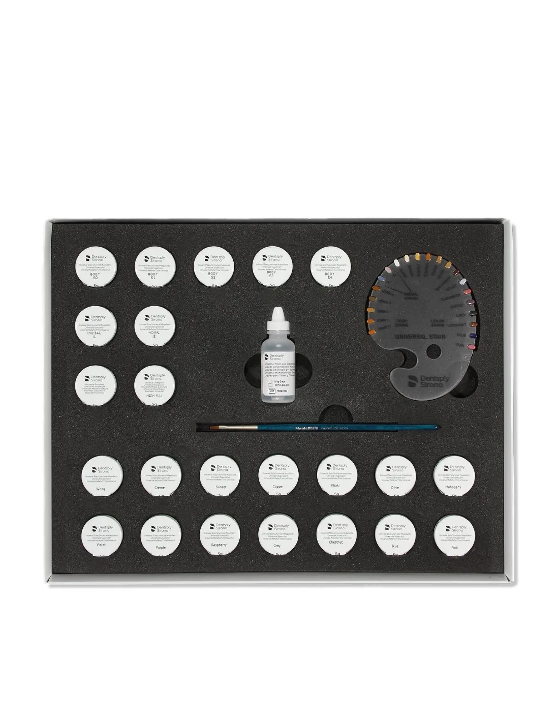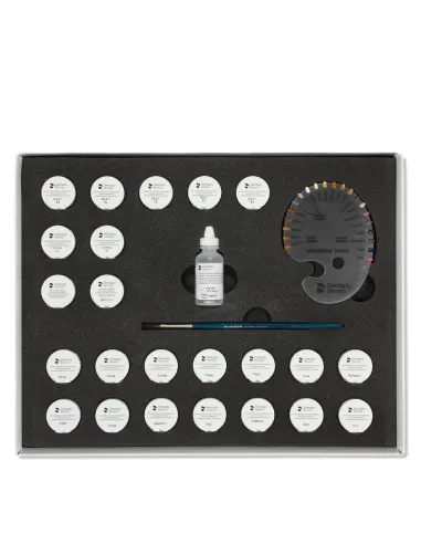 Kit Maquillaje y Glaseado Universal DS de Degudent, Dentsply Sirona es un sistema completo indicado para la individualización y la caracterización de restauraciones de los siguientes materiales: