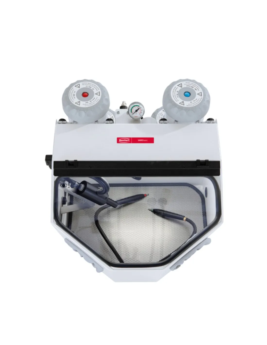 La arenadora Vario Basic de Renfert viene preparado para el montaje de 1 ó 2 depósitos para el chorreado de precisión. Por lo que también podrá eliminar los revestimientos y óxidos en trabajos de coronas y puentes, trabajos cerámicos, así como el acabado superfi cial a través de un chorreado a brillo.