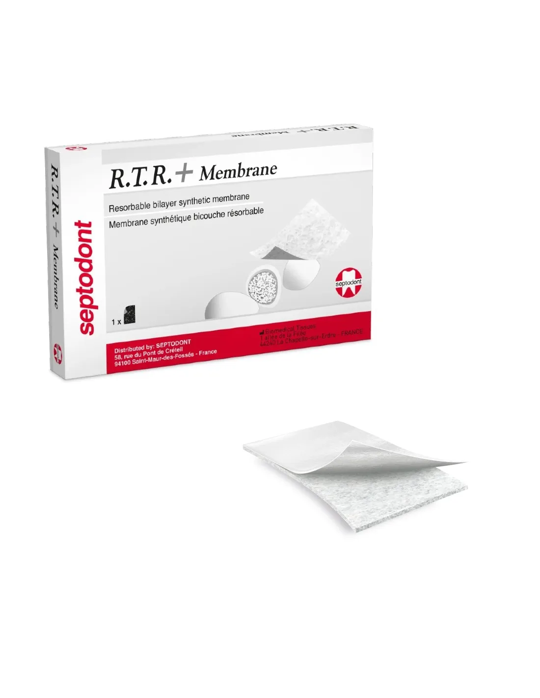 La membrana sintética reabsorbible R.T.R.+ Membrane de Septodont puede utilizarse sola o asociada a un injerto o sustituto de relleno óseo.