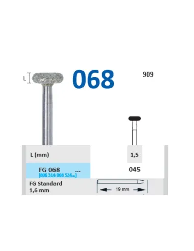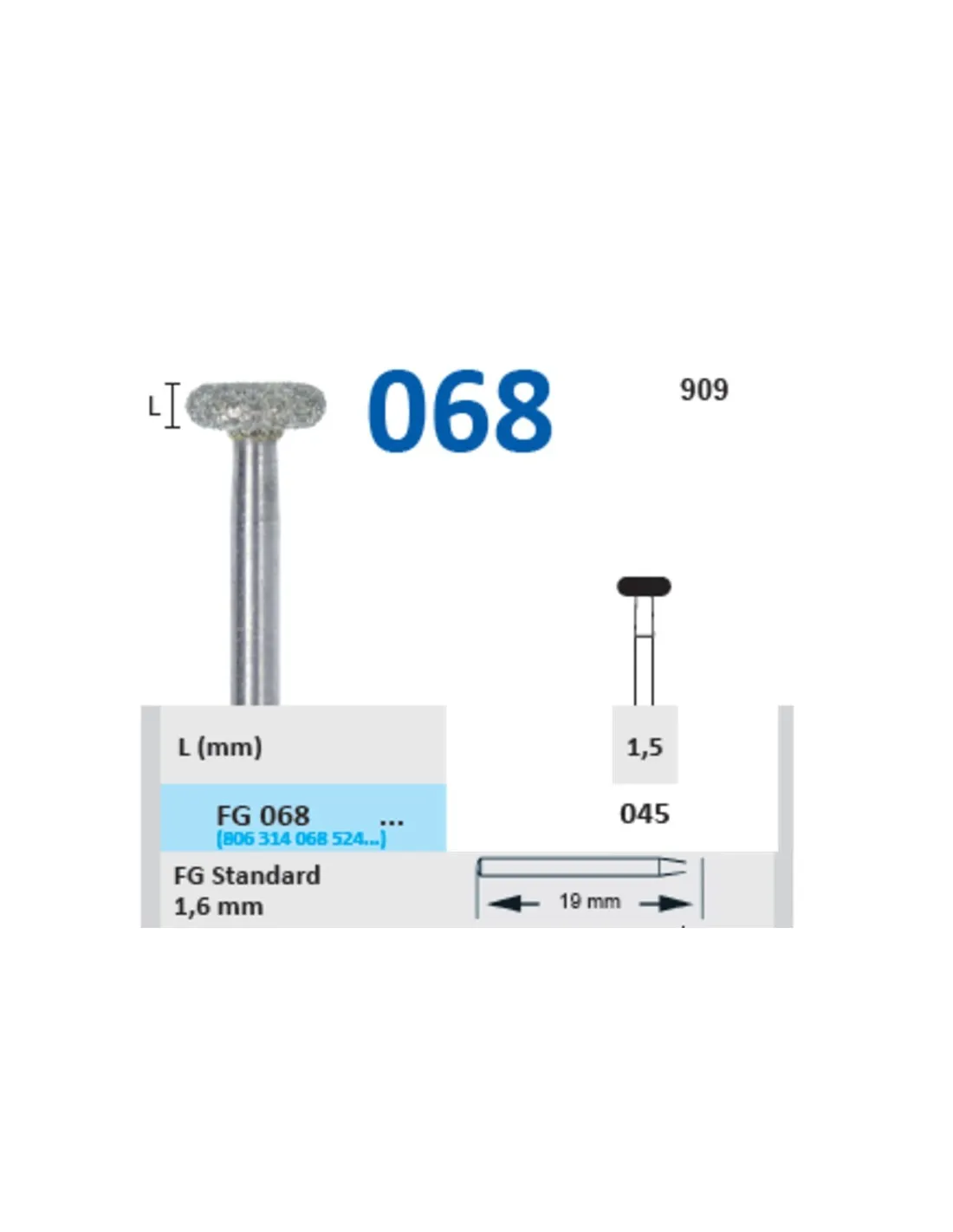 La fresa diamante FG 068 figura 909 con forma de rueda presenta un tamaño de 045, una longitud de su parte activa de: 1,5 mm y un nº iso: