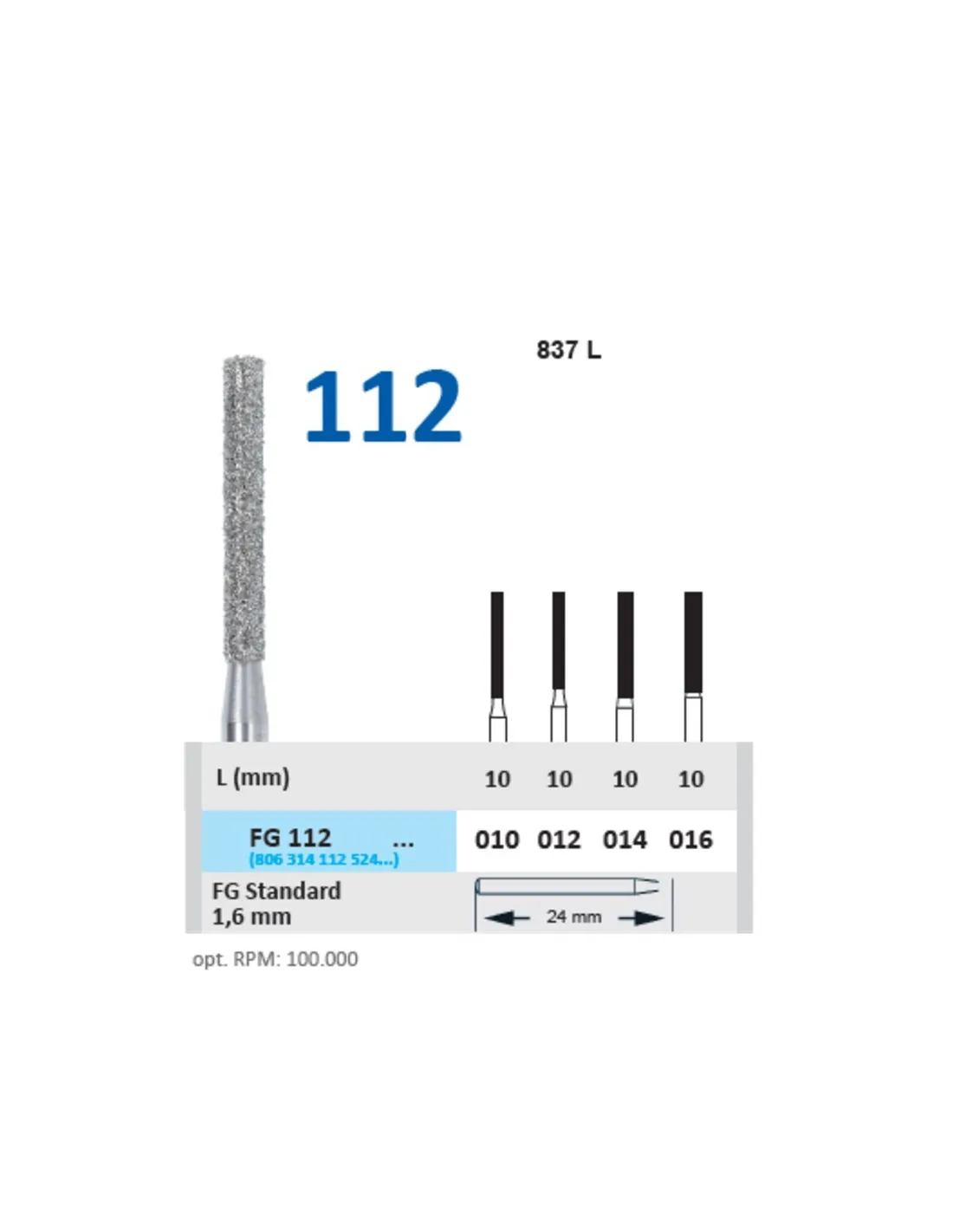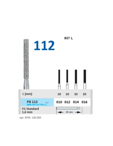 La fresa diamantada FG 112 figura 837L presenta una longitud de 10 mm y está disponible en 4 diámetros: