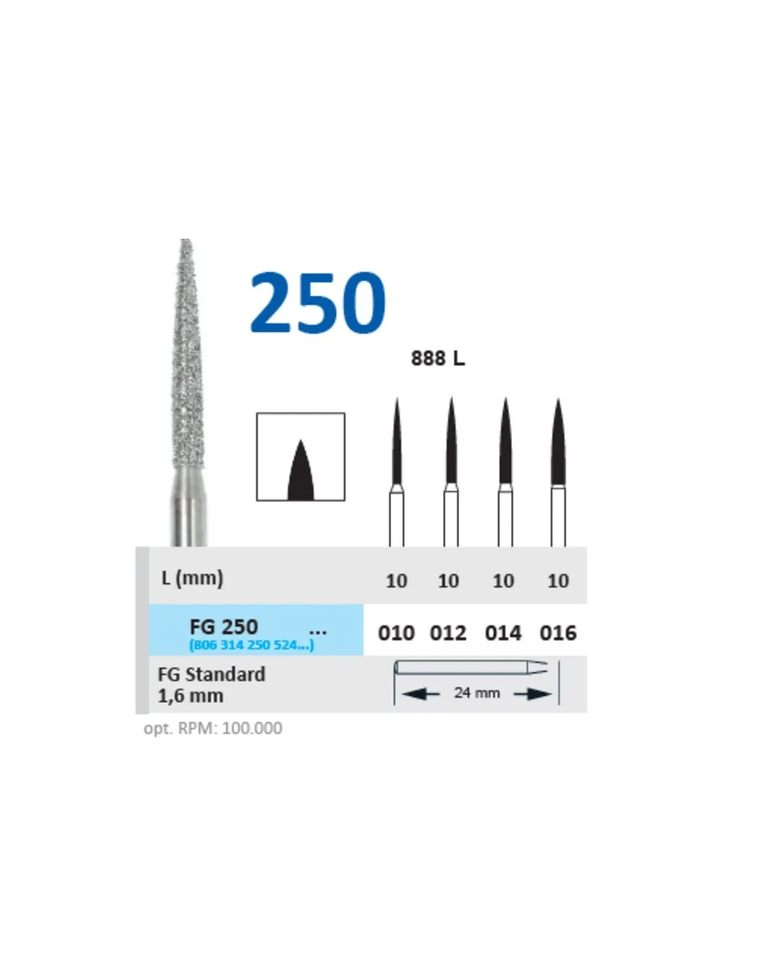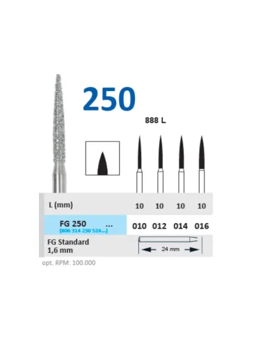 La fresa de diamante FG 250 figura 888 L presenta una longitud de 10 mm y está disponible en 4 tamaños: