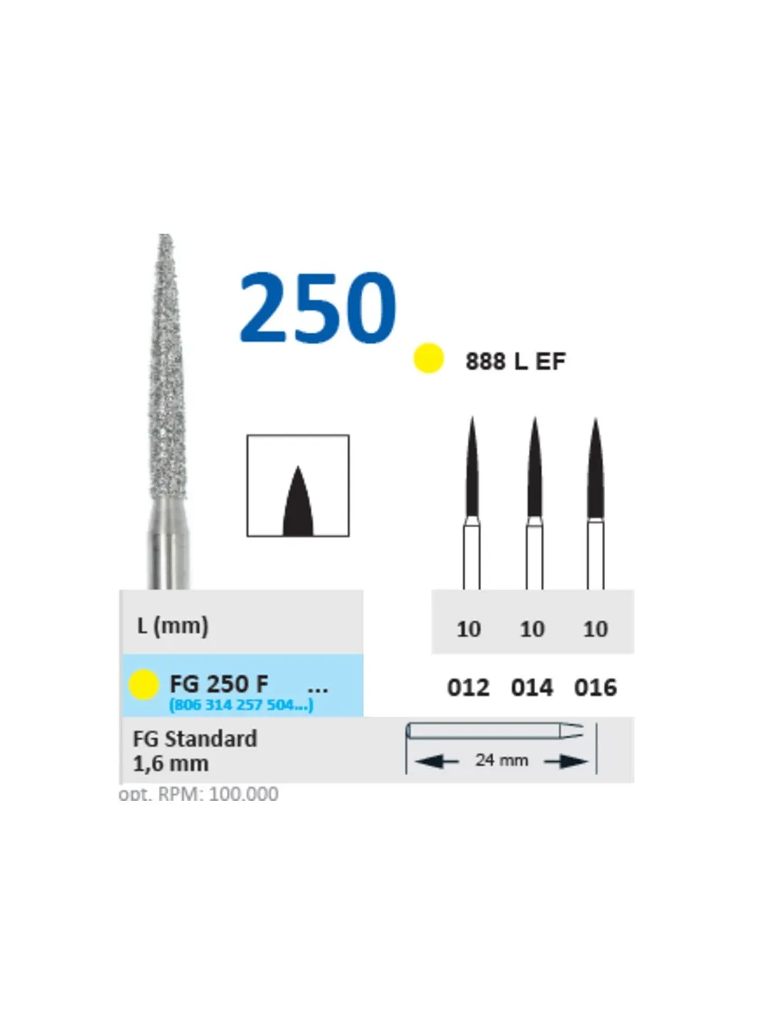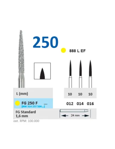 La fresa de diamante FG 250L figura 888 L EL presenta una longitud de 10 mm y está disponible en 3 tamaños: