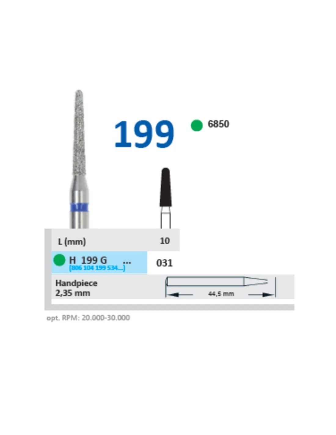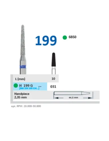 La fresa laboratorio PM 199G figura 6850 de Horico es una fresa diamantada para pieza de mano (104) con diámetro 2,35 mm y longitud de vástago 44,5 mm.