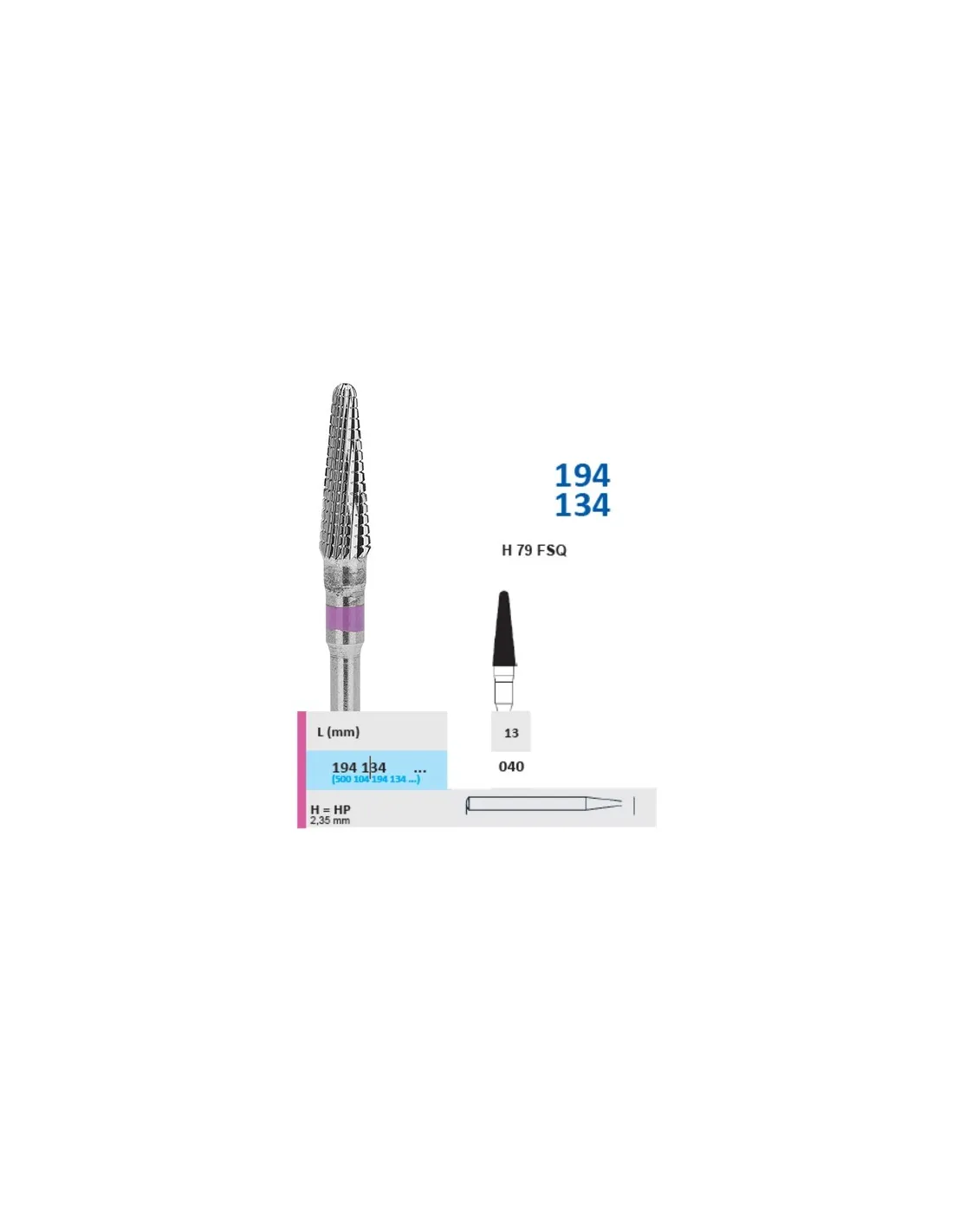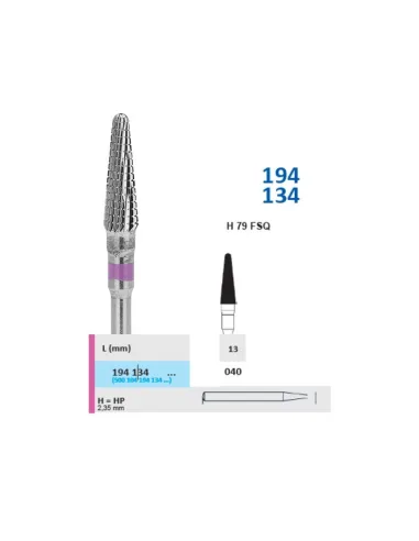 La fresa laboratorio 194 134 de Horico es una fresa de carburo de tungsteno para pieza de mano estándar (104) de diámetro 2,35 mm y longitud de vástago 44,5 mm.