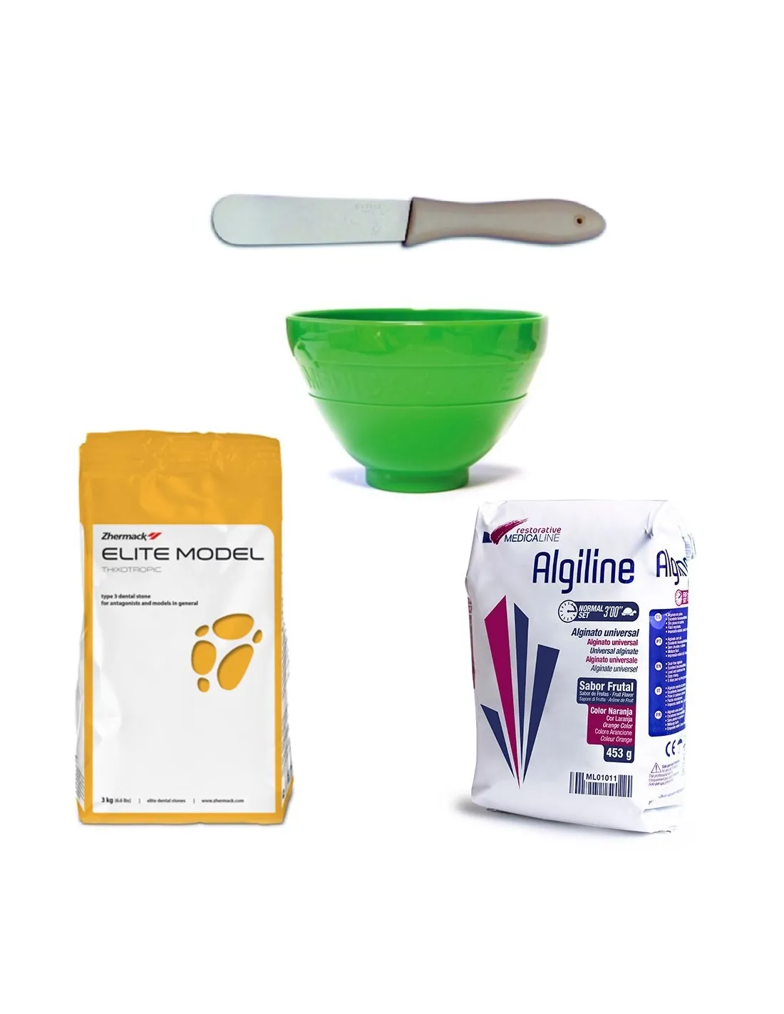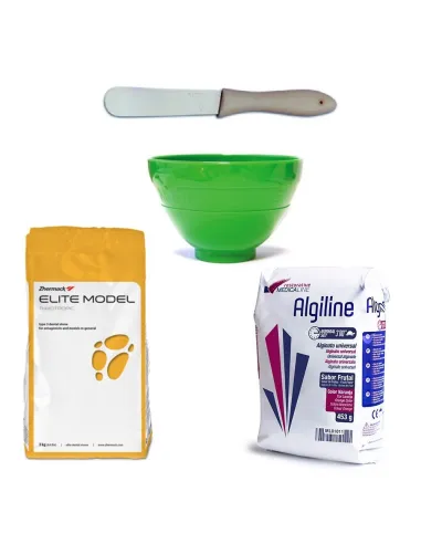 El Kit de Impresión Dental contiene 1 taza, 1 espátula, 1 bolsa de alginato y 1 bolsa de yeso.