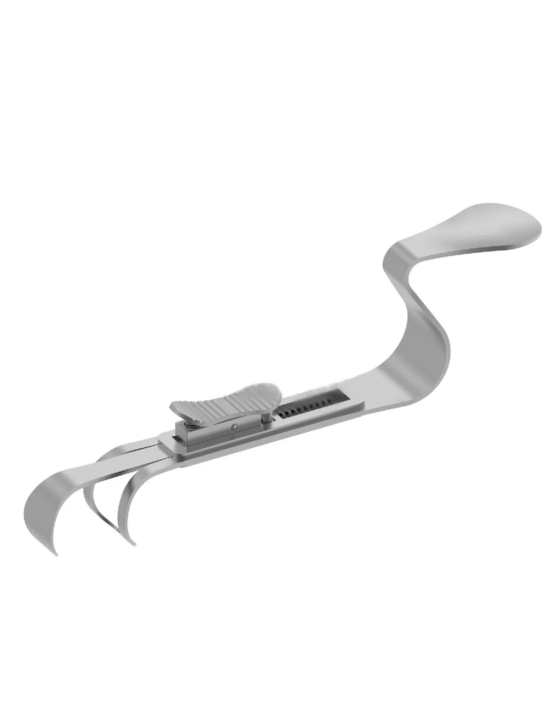 El retractor quirúrgico 638 de Carl Martin Double Hook Lopes Retractor cuenta con 3 funciones simultáneas: tracciona el labio con un lado y la mejilla con el otro, tracciona el colgajo y además cuenta con un gancho deslizante que se controla mediante un botón estable en el medio, y tracciona y sostiene el colgado.