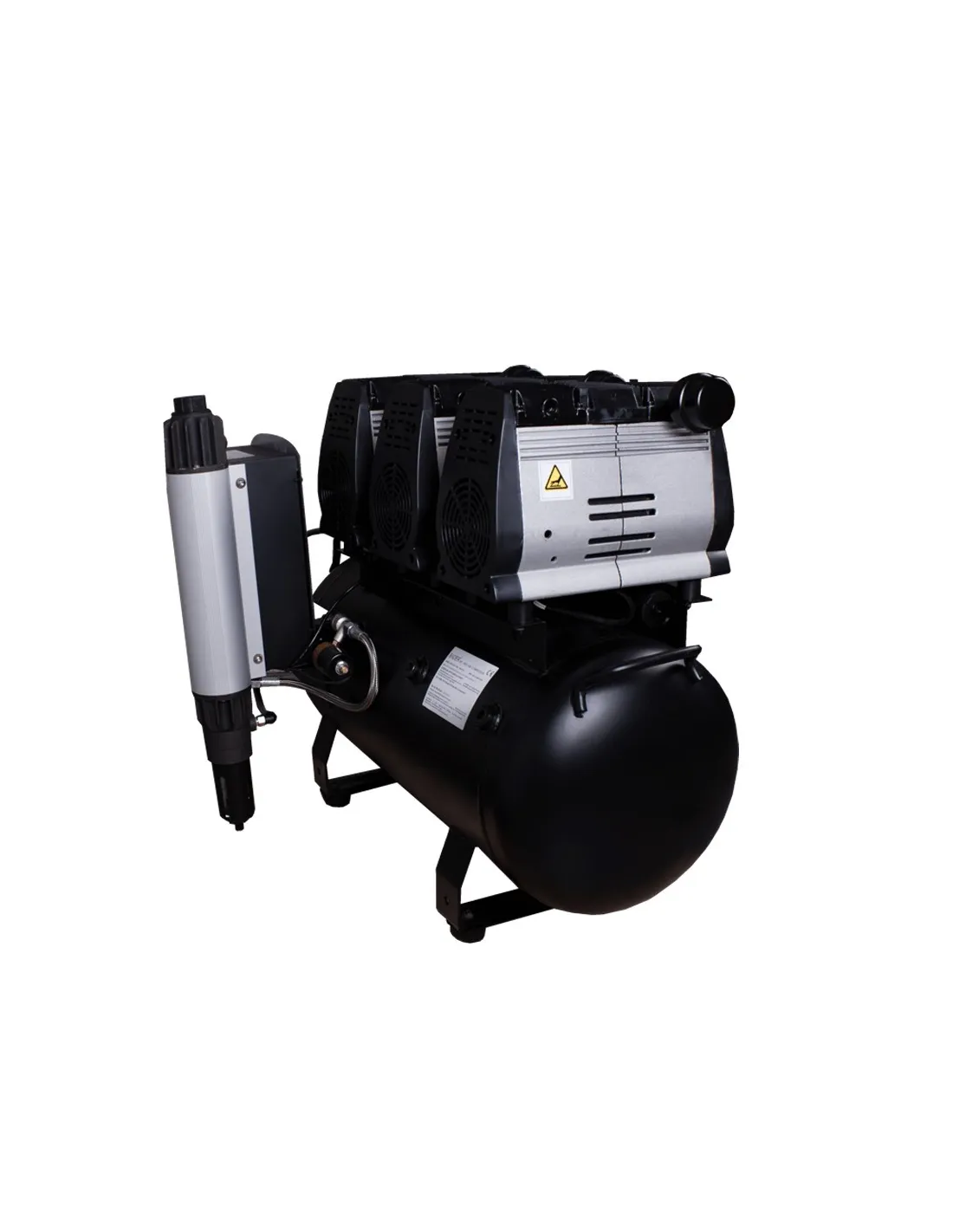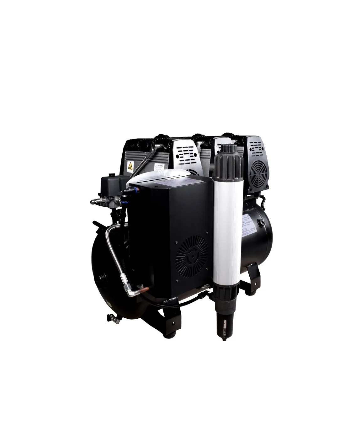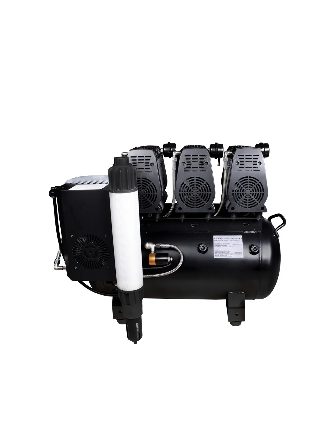 El compresor de aire de Bader de 6 cilindros con secador, filtro y condensador de aire integrados. Diseño alemán es altamente silencioso y de baja vibración.