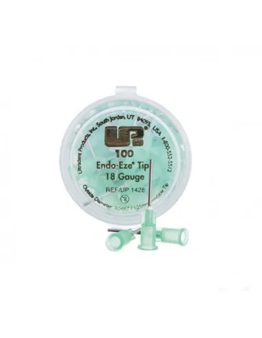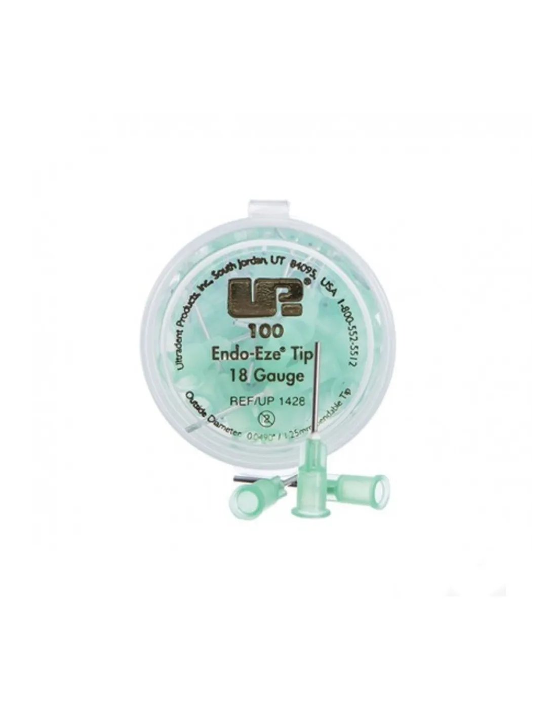 Las puntas Endo-Eze de Ultradent 18GA presentan un cuerpo de plástico y cánula fuerte y posee una aguja metálica suave y flexible, ya que se doblan fácilmente.