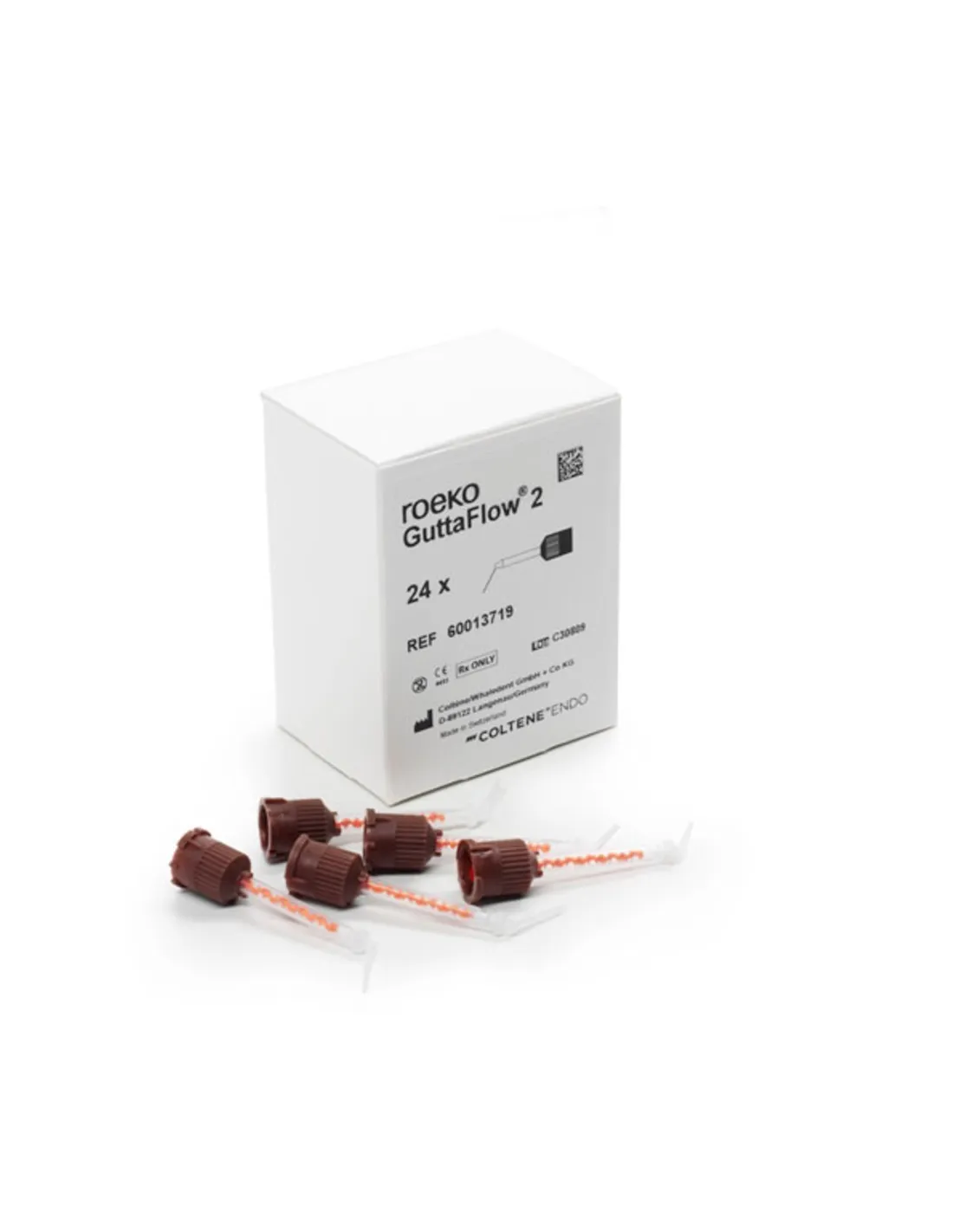 El envase de GuttaFlow 2 de Roeko Coltène contiene: 24 puntas de mezcla.