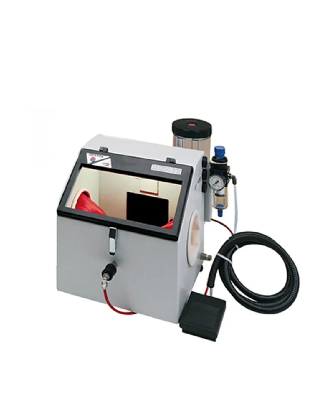La chorreadora T2 de Mestra cuenta con una pistola fija de 3 mm de diámetro, con sistema de recirculación de la arena, depósito de arena y pistola móvil de diámetro 1,25 mm.