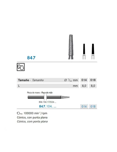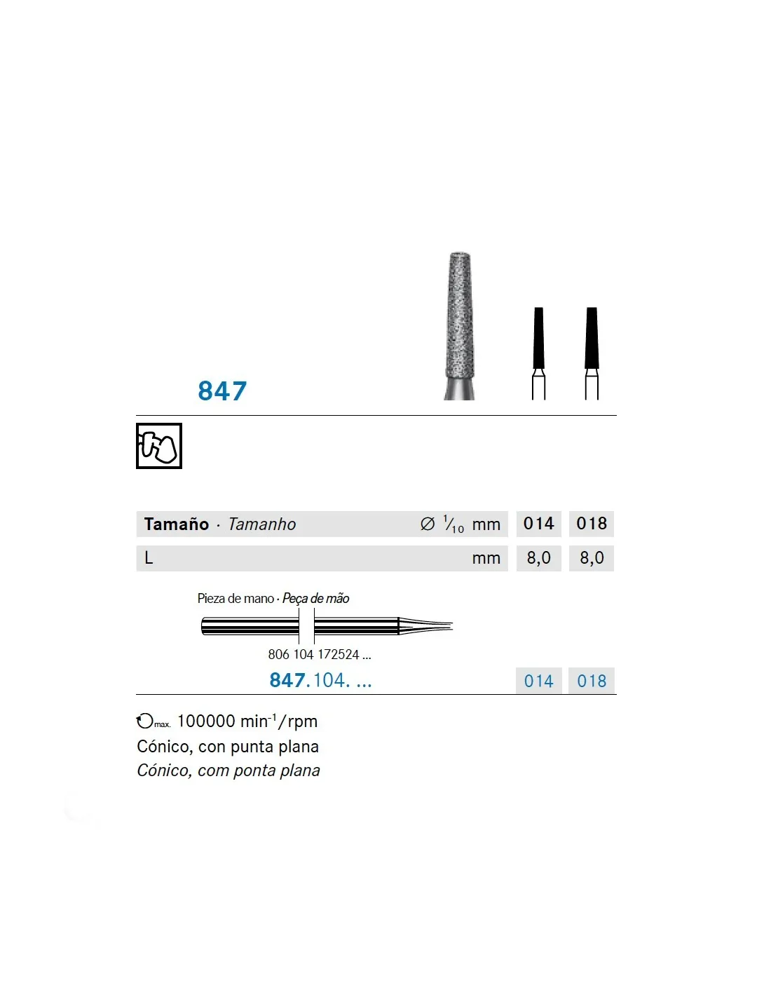 La fresa dental Komet 847 es una fresa diamantada con forma cónica, punta plana, indicada para la técnica de coronas y puentes.