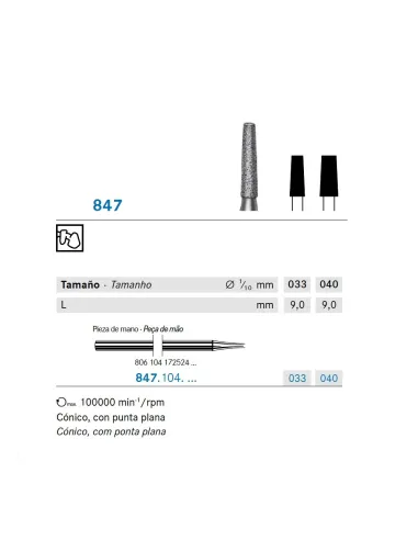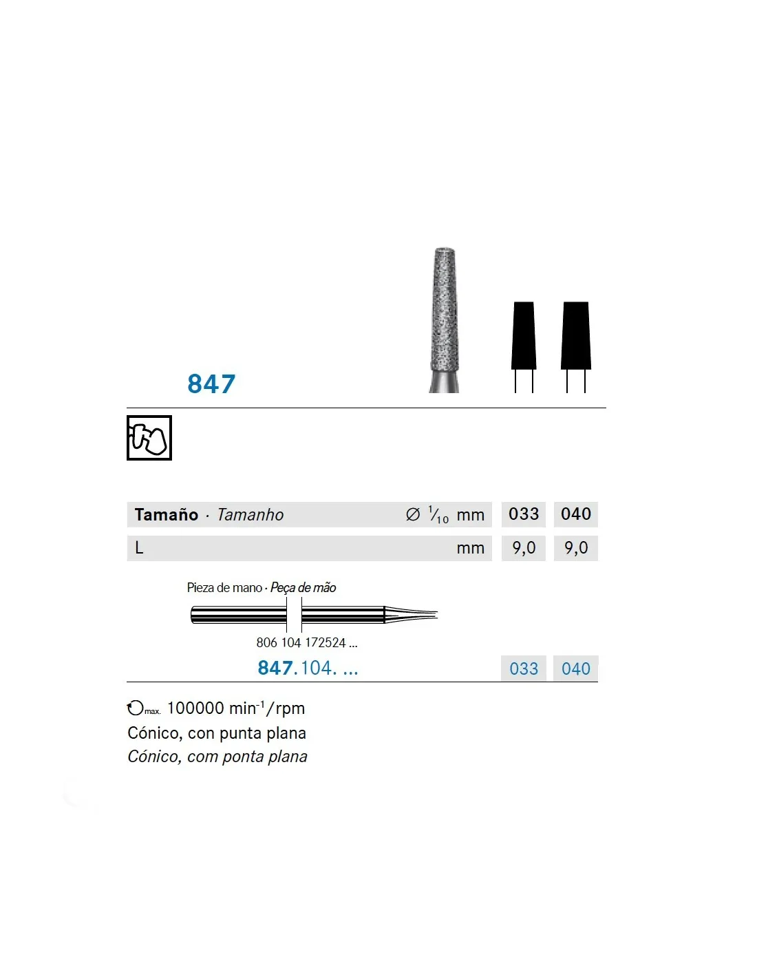 La fresa diamantada Komet 847 es una fresa PM para pieza de mano (PM 104) para uso en laboratorio dental.