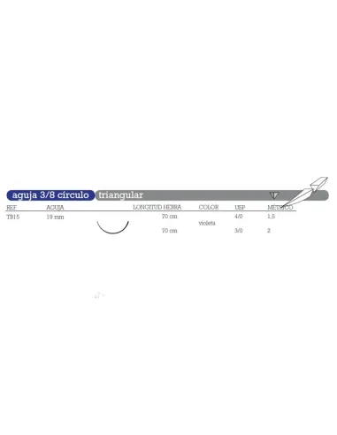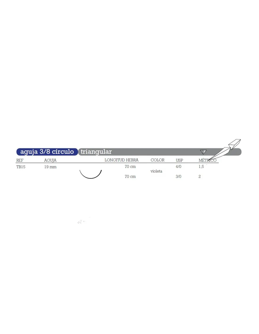 La sutura PGA TB-15 aguja 3/8 círculo triangular 19mm hebra 70 cm violeta está disponible en 2 calibres, USP: