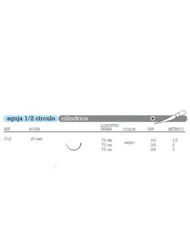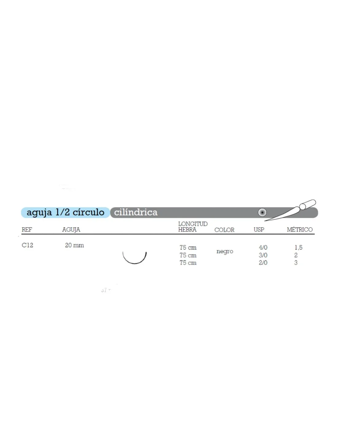 SUTURA SEDA C-12 AGUJA 1/2 CÍRCULO CILÍNDRICA 20 MM HEBRA 75 CM NEGRA, NO ABSORBIBLE