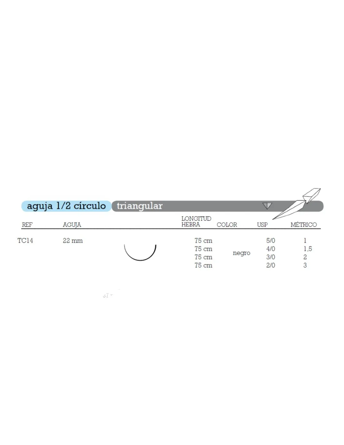 SUTURA NO ABSORBIBLE DE SEDA TC-14 AGUJA 1/2 CÍRCULO TRIANGULAR 22 MM HEBRA 75 CM NEGRA