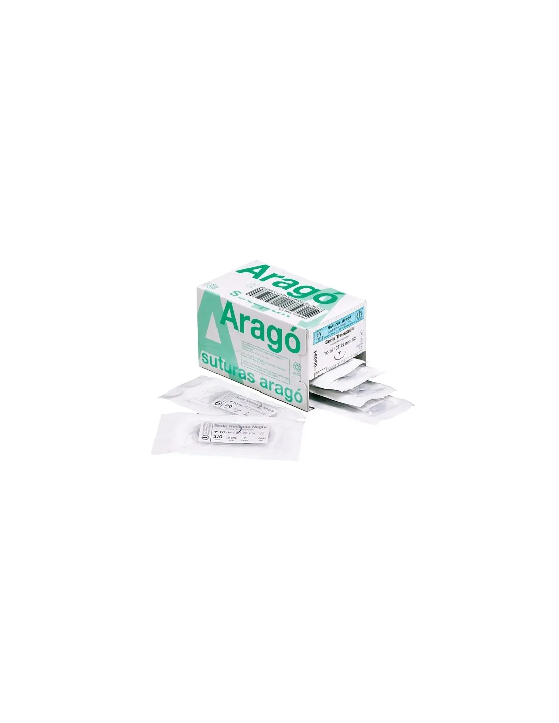 La sutura de seda Aragó TC-14 aguja 1/2 círculo triangular 22 mm con hebra de 75 cm color negra se presenta en sobres individuales esterilizados.