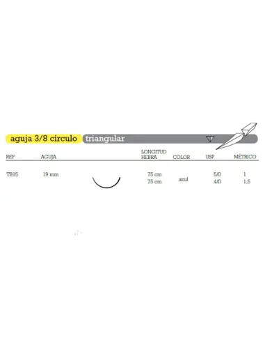 SUTURA NO ABSORBIBLE DE NYLON TB-15 AGUJA 3/8 CÍRCULO TRIANGULAR 19 MM HEBRA 75 CM AZUL