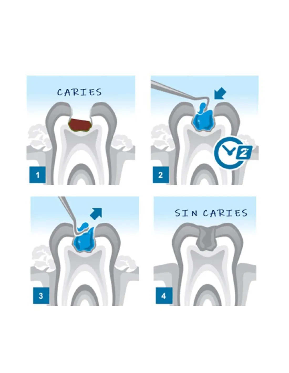 - Elimina las caries sin anestesia ni instrumental rotatorio.