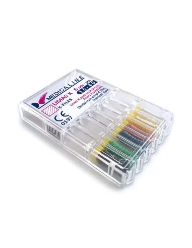 Se trata de Limas K de Medicaline para endodoncia, fabricadas en acero inoxidable, disponibles en diferentes numeraciones y distribuidas en cajas de 6 unidades.