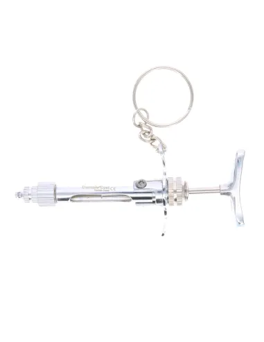 Original llavero con forma de jeringa dental, en acero inoxidable y con movimiento (se abre y se cierra). Se trata de una jeringa en miniatura con cadena para colgar las llaves; se abre y se cierra como una jeringa real.