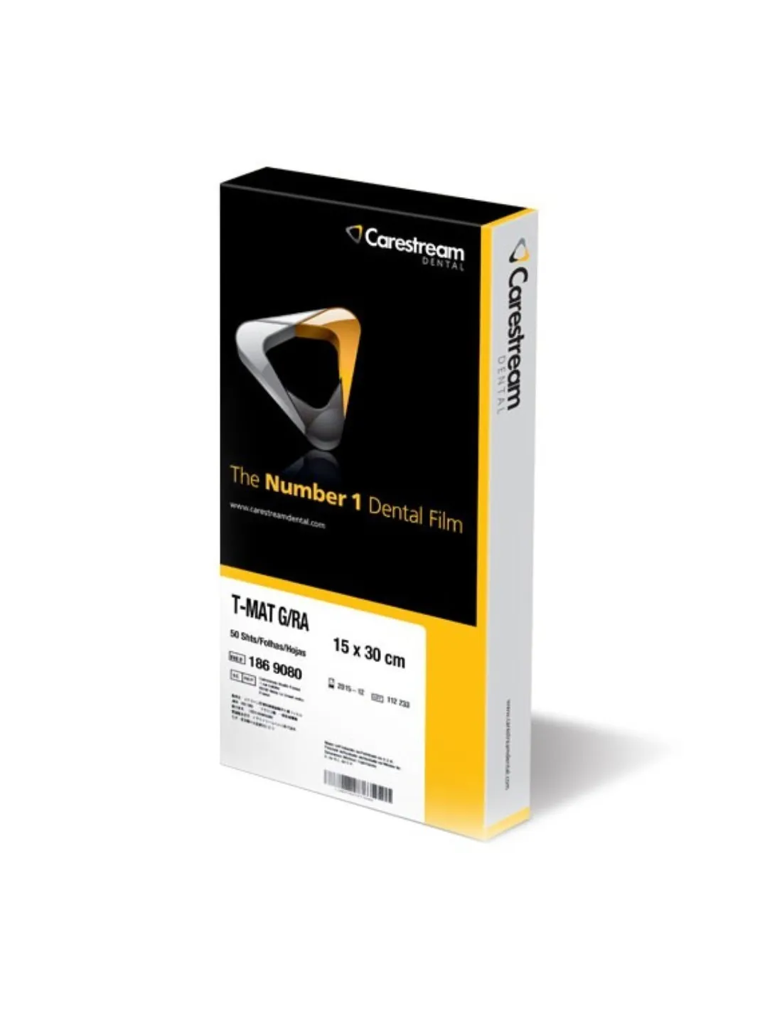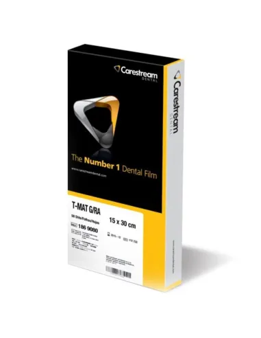 La película radiográfica extraoral T-MAT-G/RA de Kodak Carestream ofrece imágenes de extraordinaria nitidez, alta resolución y contraste con un bajo nivel de jaspeado de las estructuras dentales intervenidas, a la vez que mantienen una buena visibilidad de los tejidos blandos cuando se utiliza con las pantallas Lanex Regular o Medium.