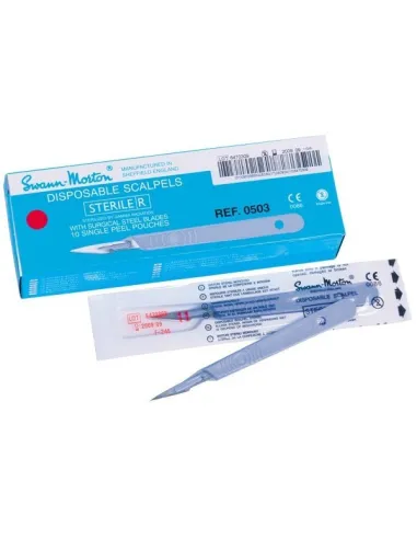 Bisturí desechable con mango de Swann Morton compuesto por un mango de plástico y una hoja de bisturí fabricada en acero al carbono.