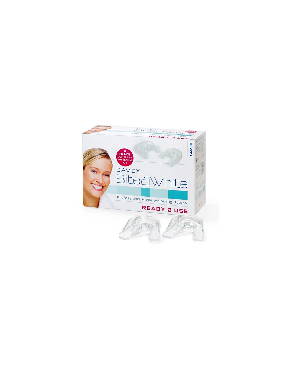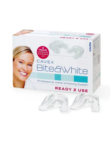 Cavex Bite&White Ready 2 Use es un sistema de blanqueamiento compuesto por cubetas precargadas con peróxido de hidrógeno al 6% para el blanqueamiento en el hogar.