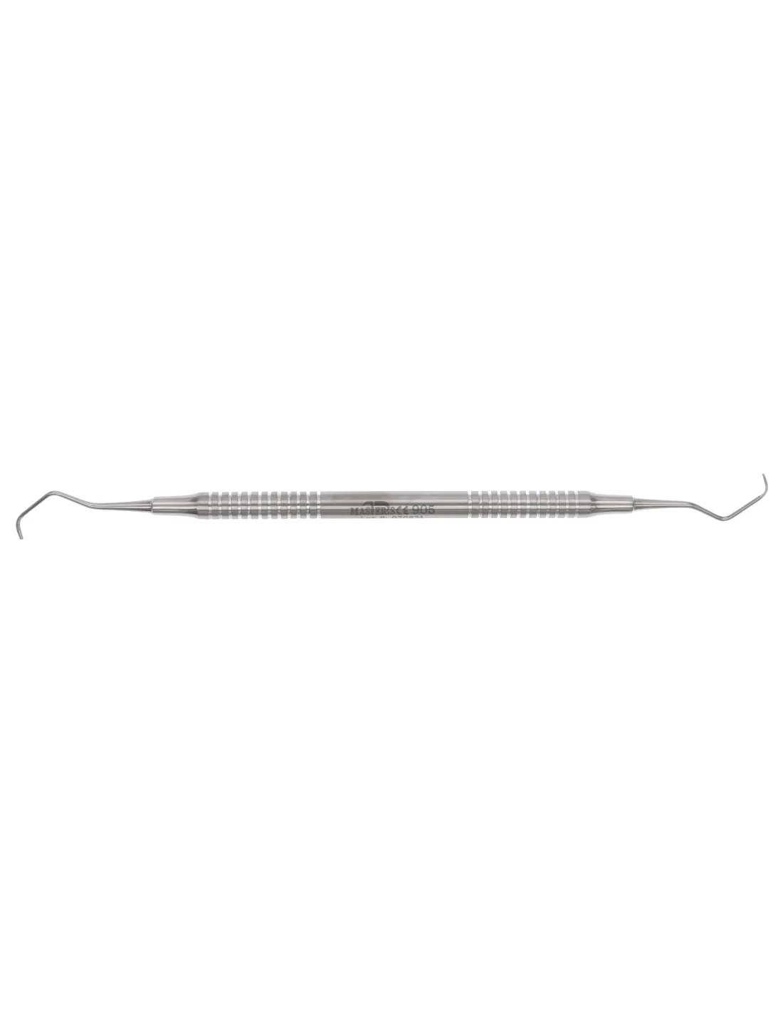 La cureta Columbia 4R/4L de Masters es un instrumento manual para el tratamiento periodontal, especialmente indicado para la retirada del sarro regular o duro de todas las superficies supara y subgingivales.