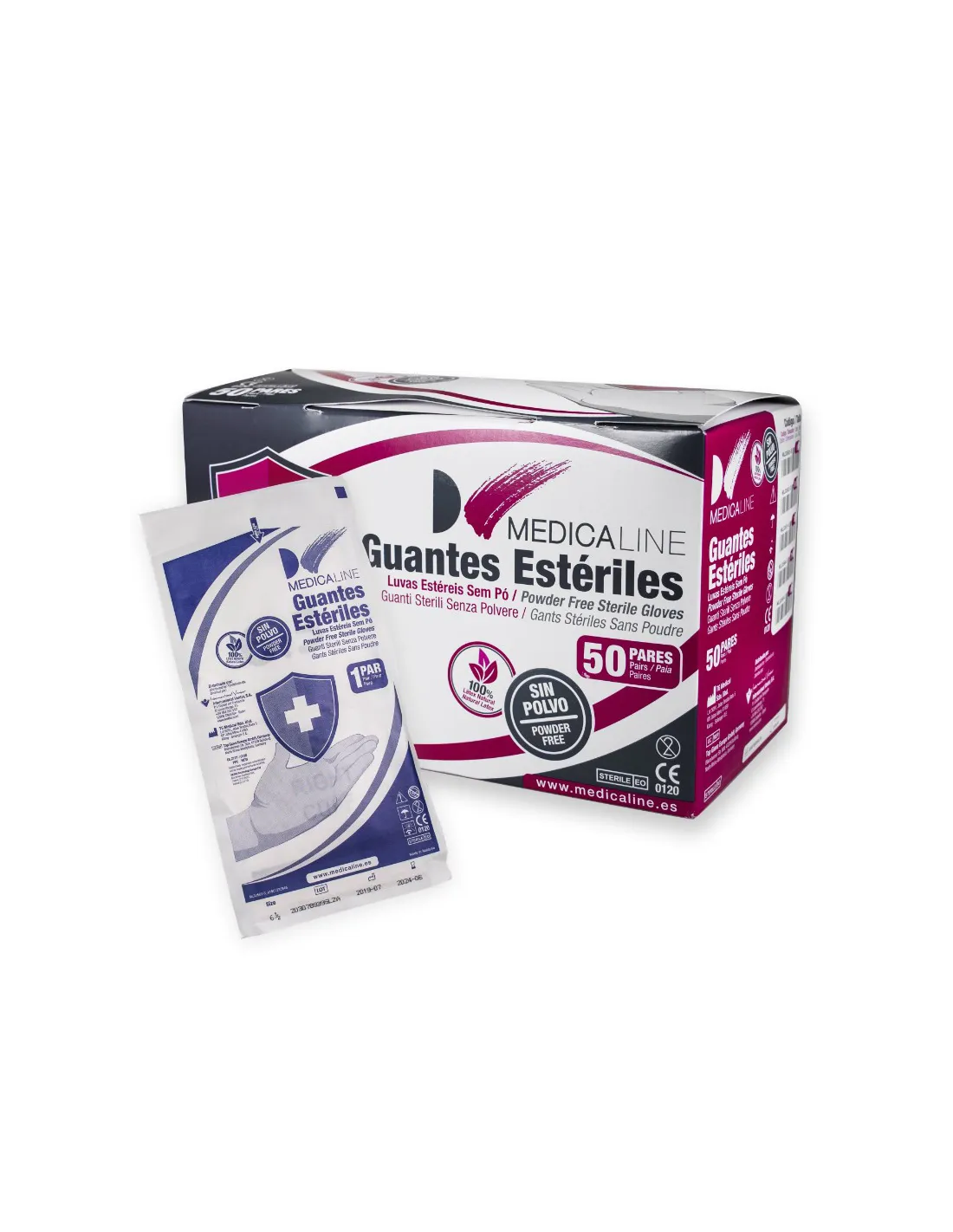 Los guantes de látex de Medicaline se presentan caja de 100 unidades (50 pares), a elegir numeración de talla entre las disponibles.