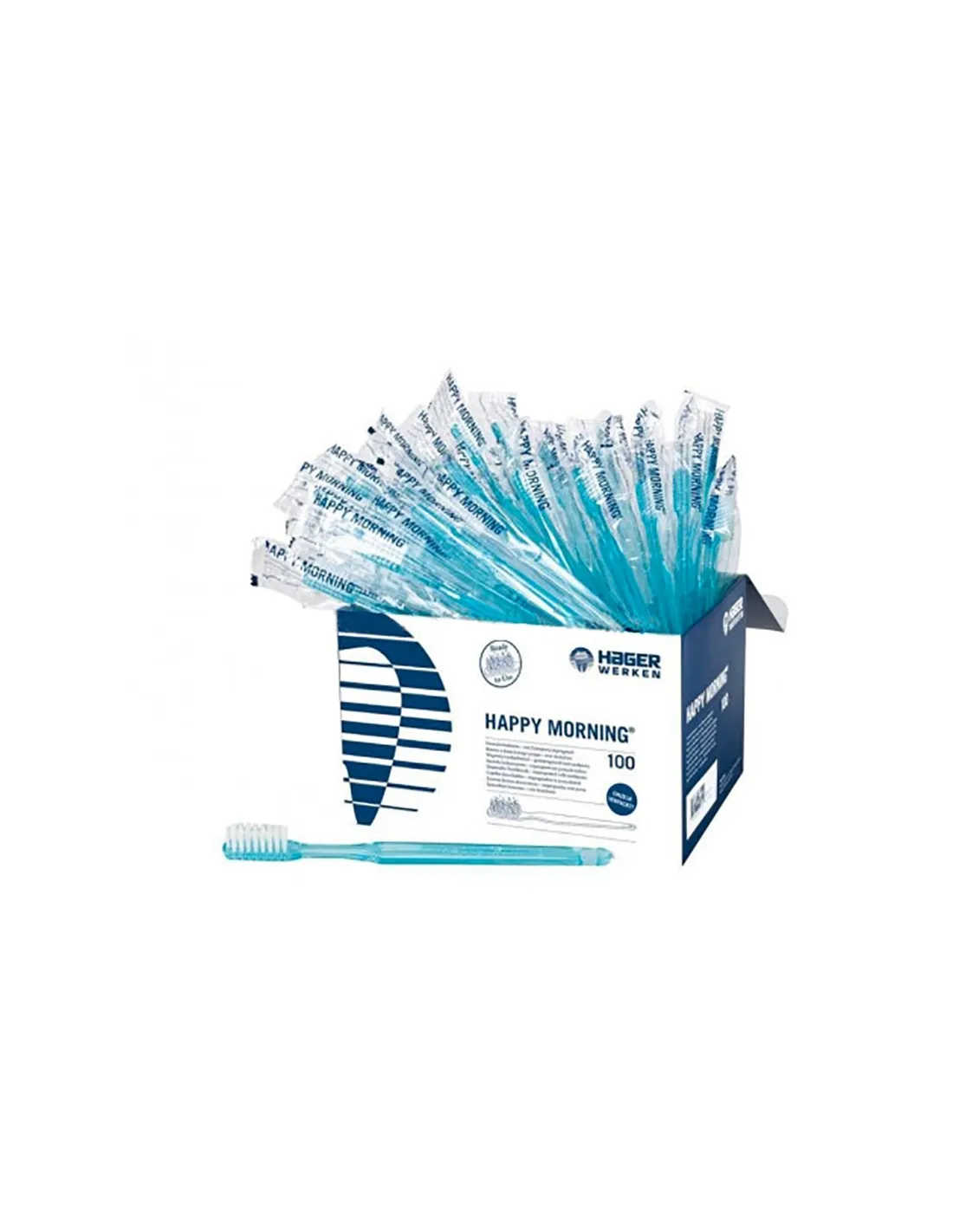 Los cepillos dentales con dentífrico Happy Morning de Hager Werken es un cepillo de dientes, de un solo uso, que incorpora pasta de dientes para una rápida pero eficaz limpieza bucal cuando no estamos en casa.