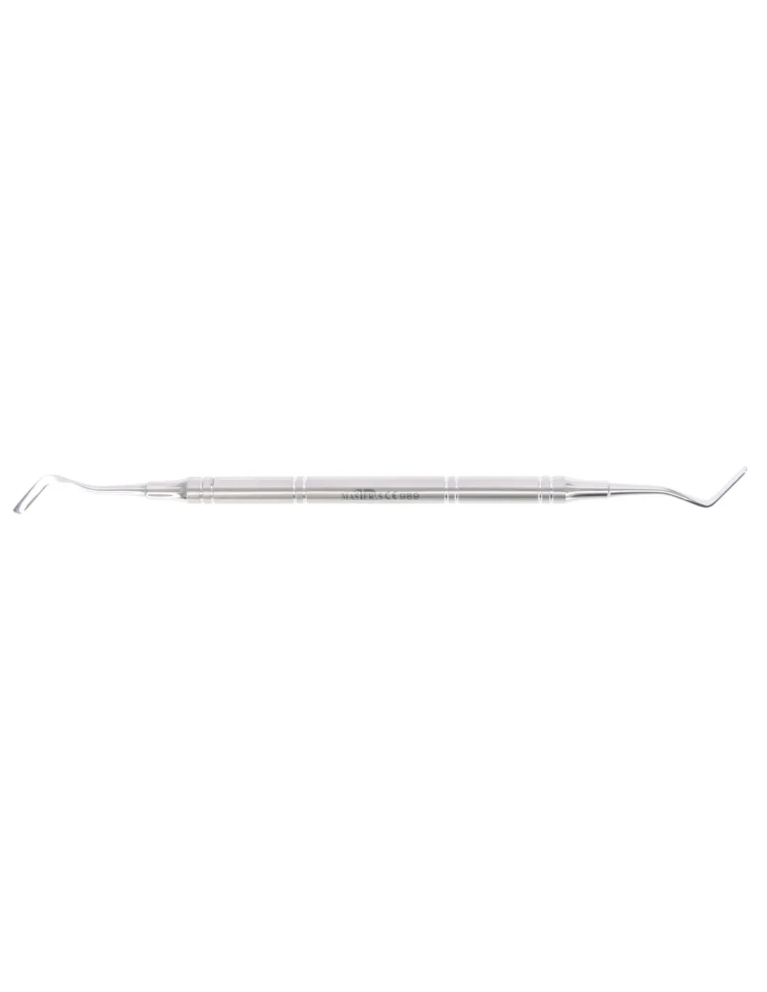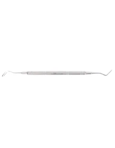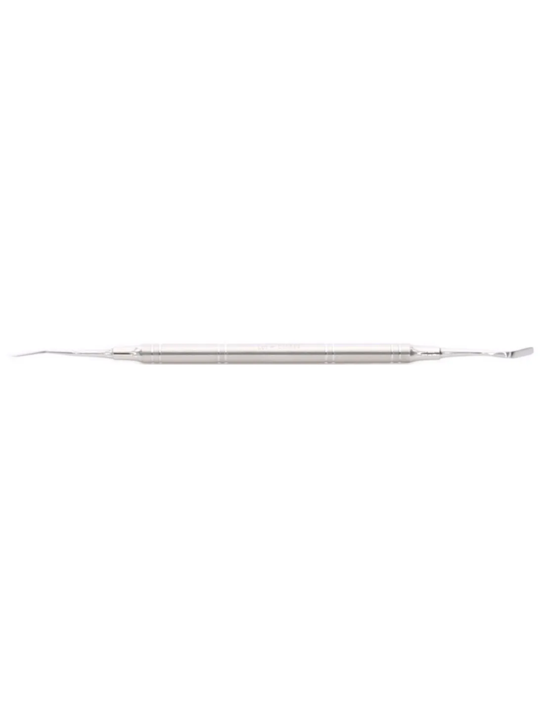 Espátula doble de partes activas planas, de tamaño mediano. Sirven para aplicar el material de obturación, separar matrices, introducir hilos de retracción,…