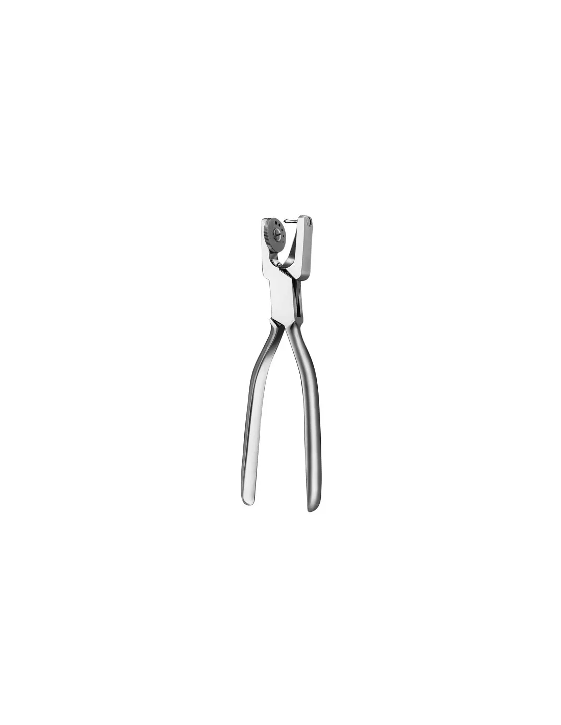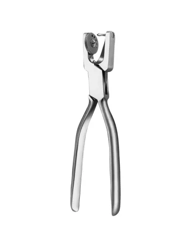 El perforador de diques Ainsworth tiene la bisagra detrás del disco. Por su parte, el disco tiene 5 agujeros, 0,5 mm el más pequeño y 2,5 mm el mayor.
