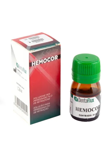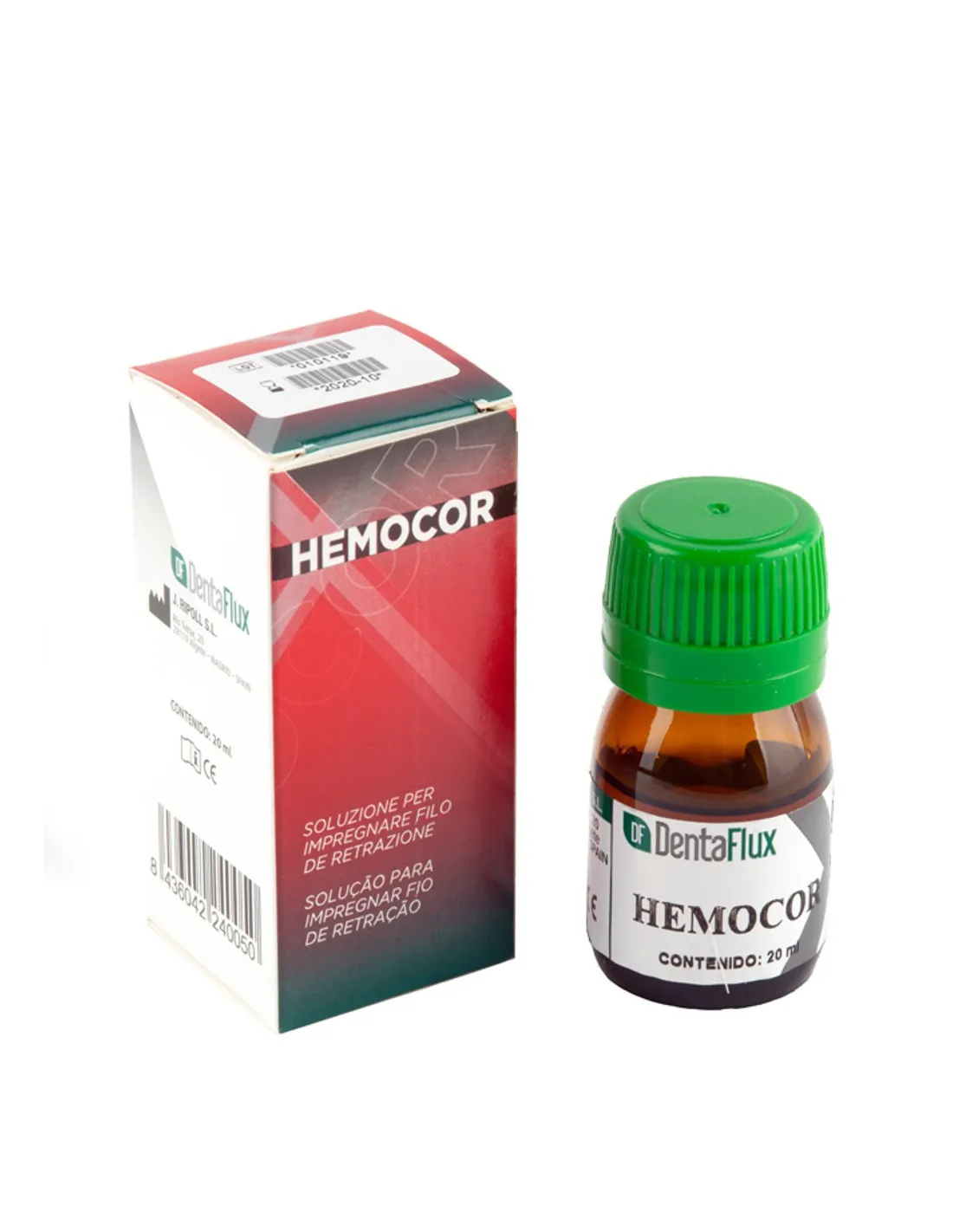 Hemocor de Dentaflux es una solución de sulfato férrico para impregnar hilos retractores. Al endurecer sobre la superficie de la mucosa dental provoca una retracción gingival temporal. De esta forma, las impresiones que se tomen incluirán una mayor superficie del diente.