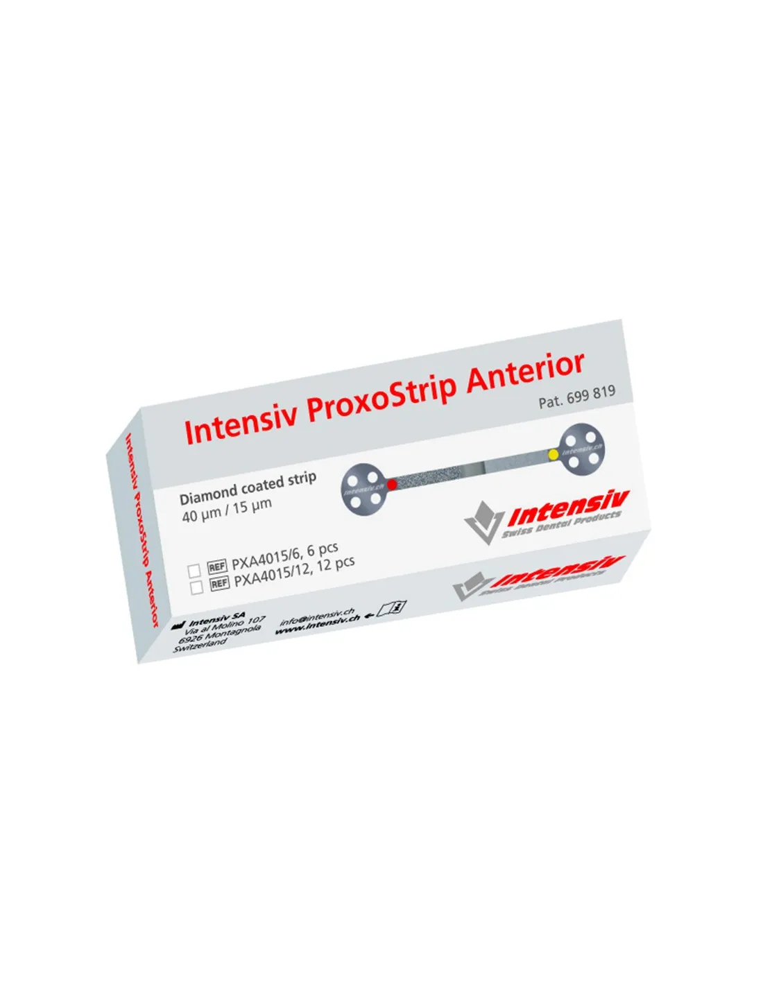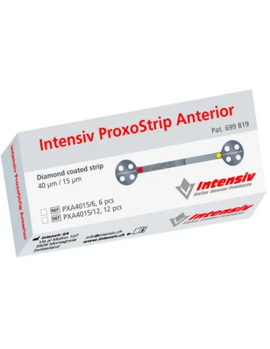 Proxostrip PXA es un strip diamantado anterior con ambos lados diamantados y dos superficies de trabajo de diferentes granulometrías, una roja de 40 µm y otra amarilla de 15 µm.