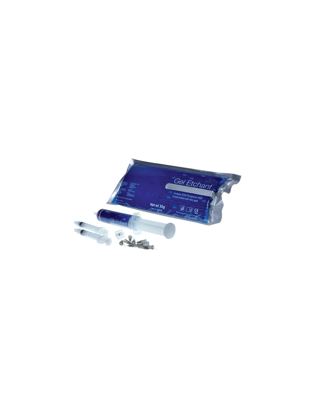 El pack económico de Gel Etchant contiene 30 gr de gel grabador en jeringa Jumbo, 2 jeringas intraorales vacías, 30 puntas dispensadoras y 1 conector Luer para rellenar las jeringas intraorales.