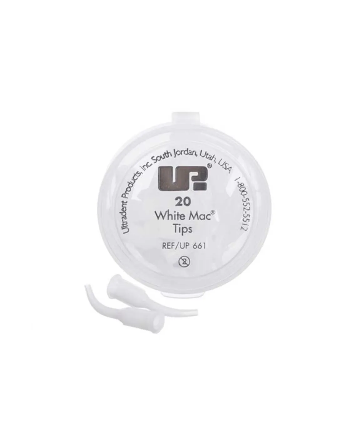 Las puntas White Mac de Ultradent son puntas blancas y curvadas para la aplicación de materiales muy viscosos.