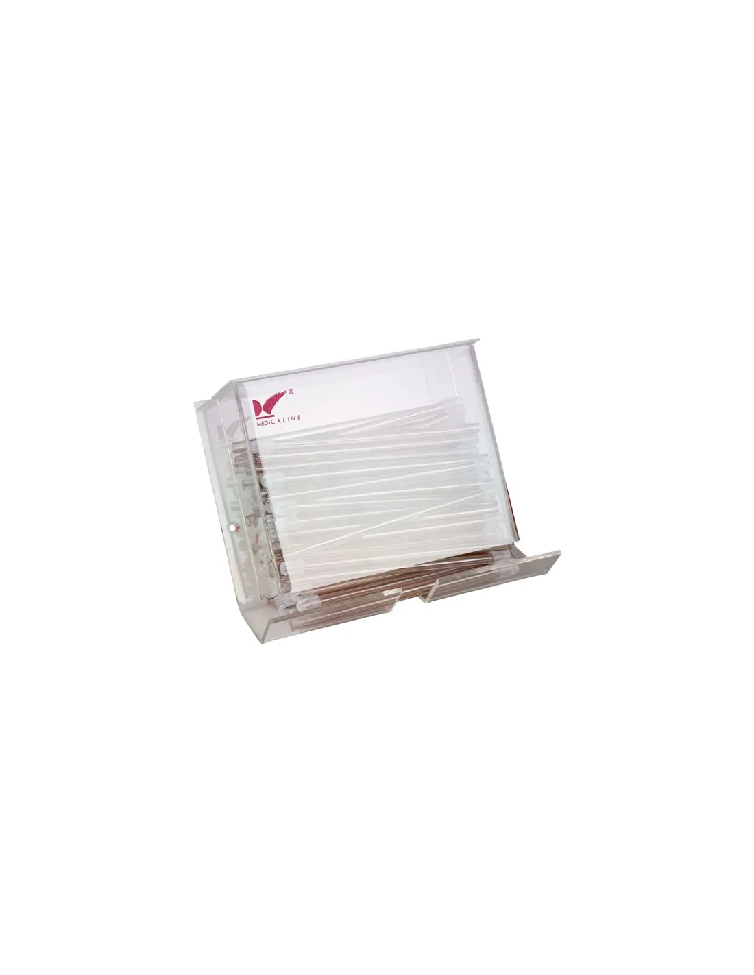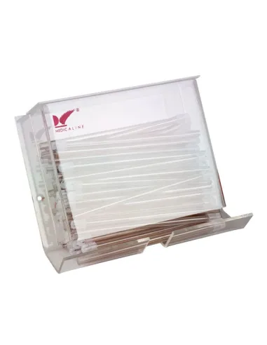 Dispensador de plástico para colocar los aspiradores de saliva. Practico contenedor con posibilidad de colocación en la pared, para trabajo mas eficaz y cómodo.
