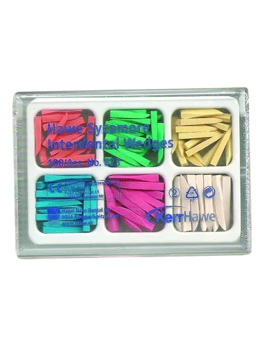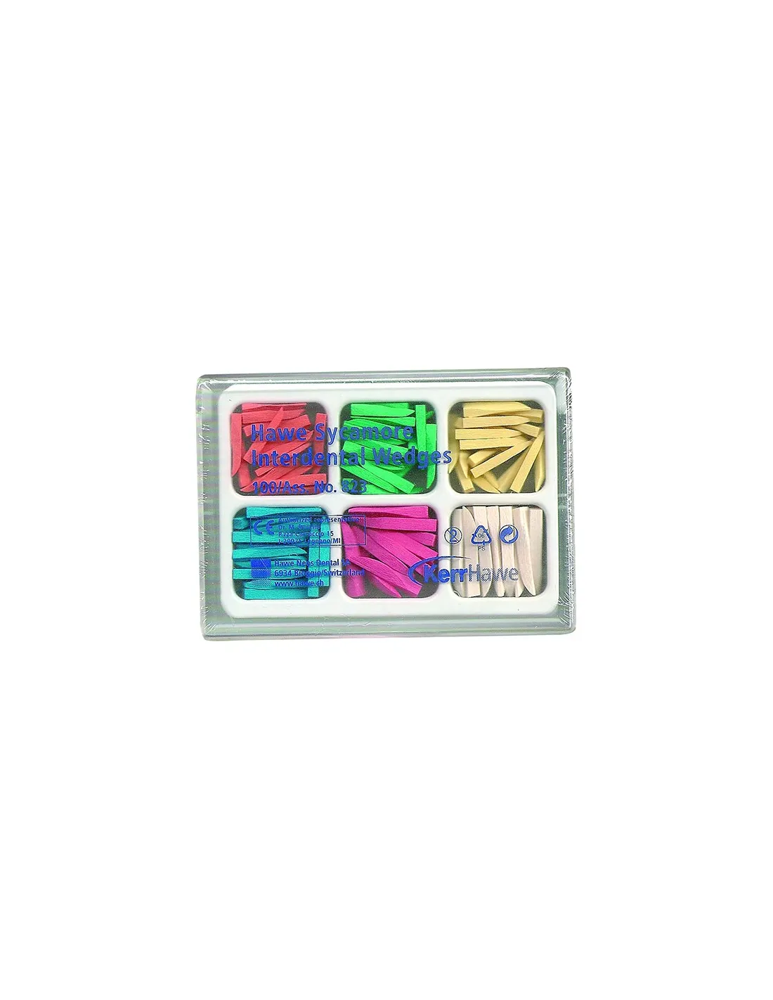 Las cuñas interdentales Hawe de Kerr están fabricadas con madera de arce sicómoro inastillable, garantizando estabilidad y una cierta compresión. Además están modeladas de acuerdo a la anatomía del espacio interdental, por lo que aseguran una perfecta adaptación al diente.