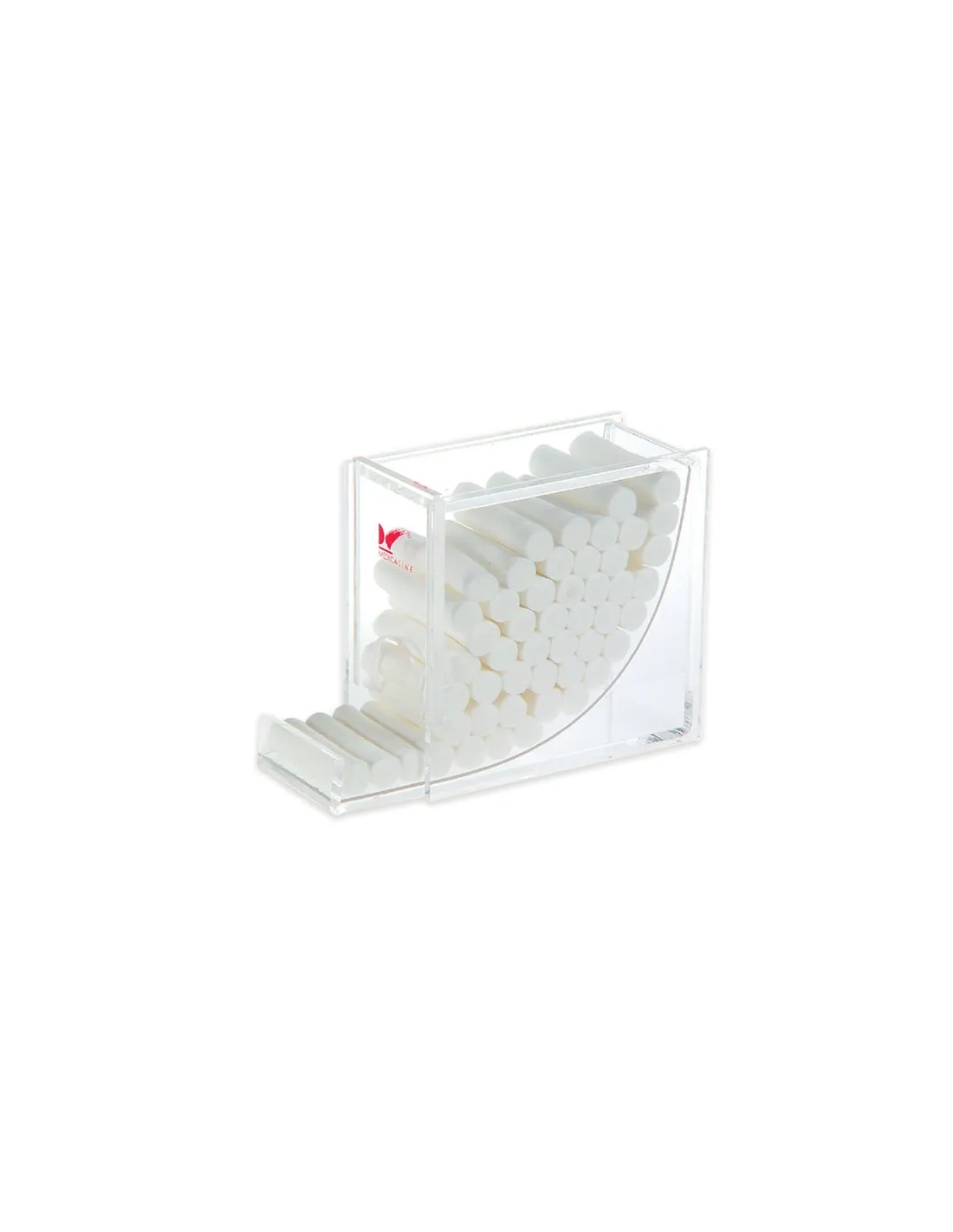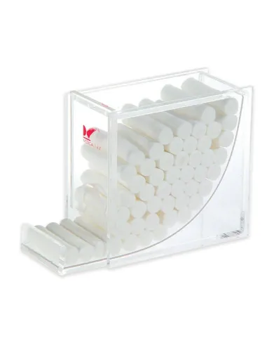 Dispensador de plástico para colocar los rollos de algodón. Se sacan facilmente con su sistema de presión superior.