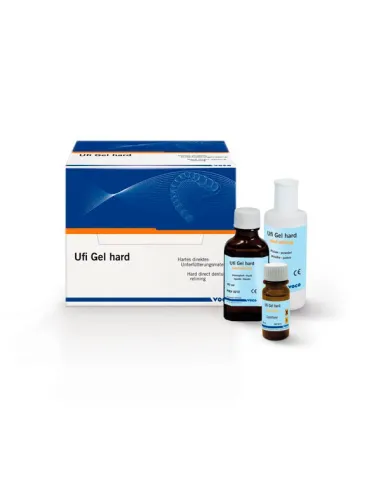 Este material de rebase es rígido, duradero y polimerizable en frío a base de polimetacrilatos. No desarrolla calor al fraguar en la cavidad bucal, por lo que el ajuste es correcto. UfiGel Hard no contiene MMA, es de sabor y olor neutros, y tiene un color estético y estable.