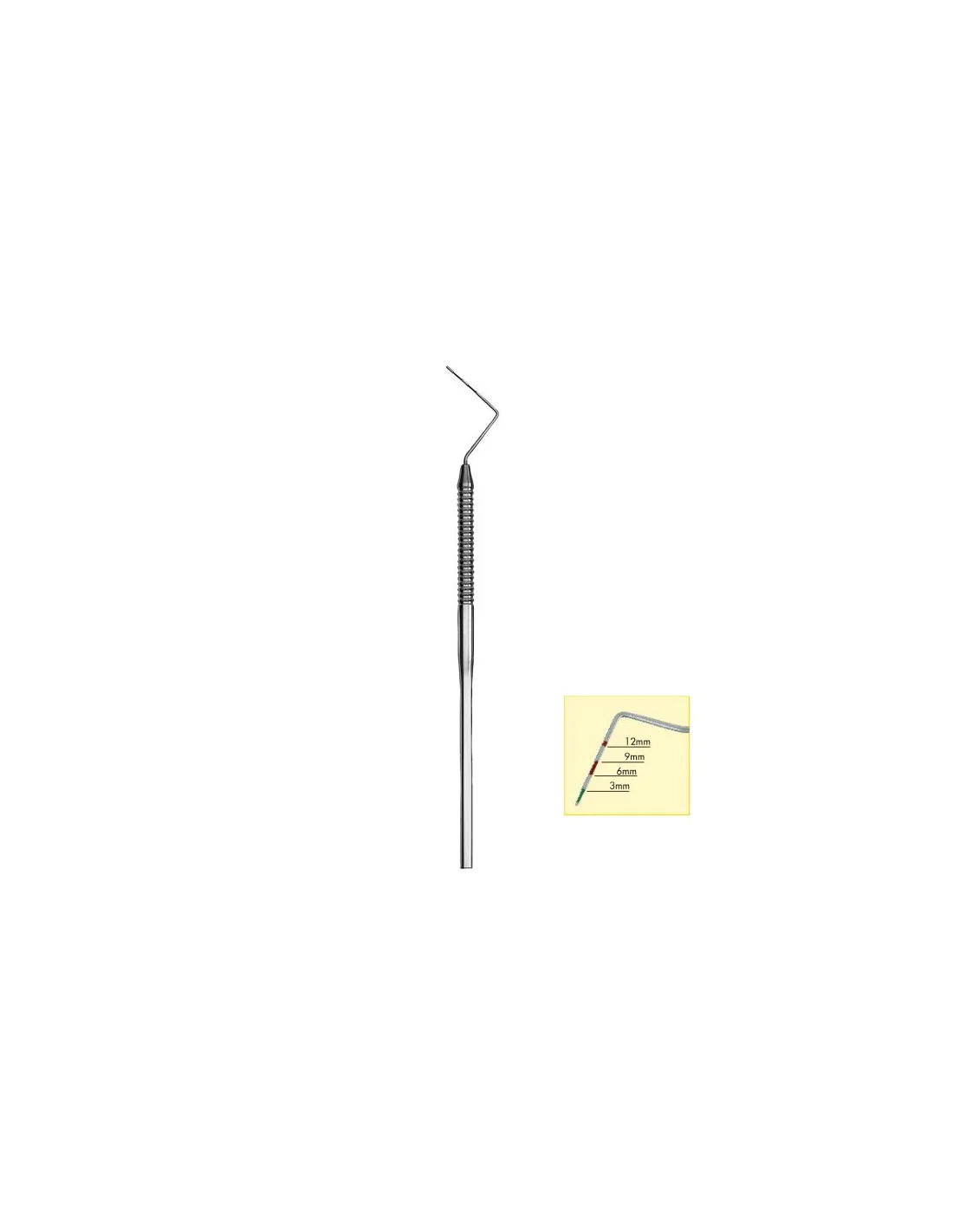 Sonda periodontal de Carl Martin, modelo 973/CP12 con acoples intercambiables. Con mango hueco, inoxidable y ligero. Una única parte activa, con marcas de colores para indicar la distancia (3, 6, 9 y 12mm).