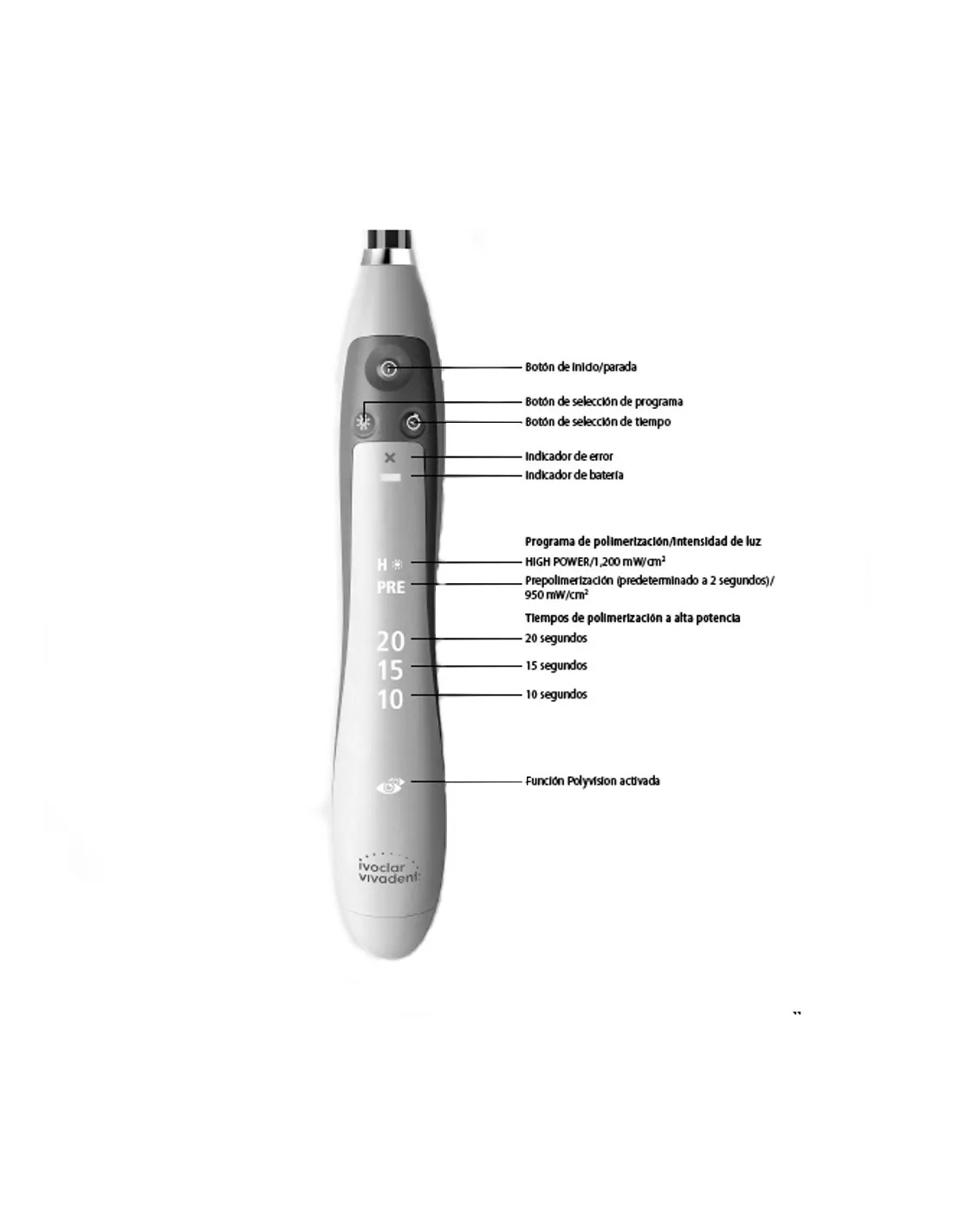 - Prepolimerización (predeterminado a 2 segundos)/ 950 mW/cm2