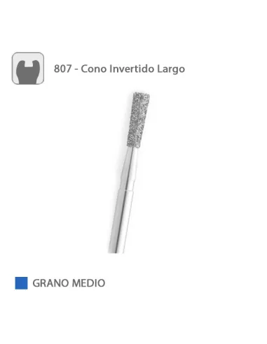 La fresa 807 de Medicaline es una fresa diamantada FG para turbina, con forma de cono invertido largo. El tamaño del grano es medio (color azul).