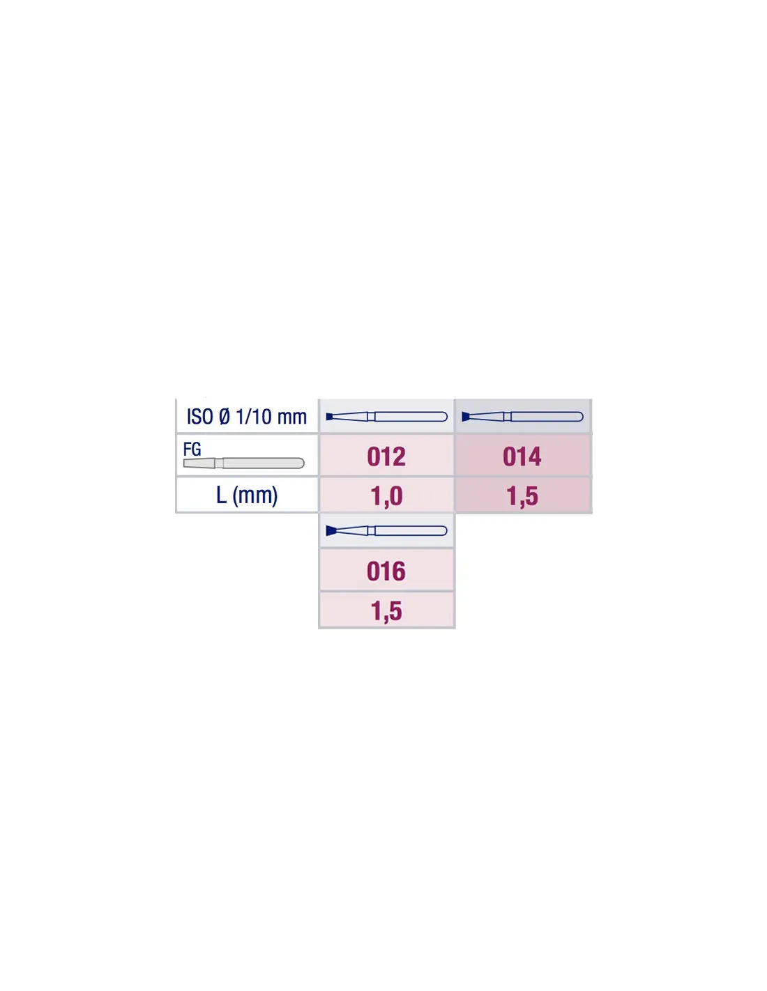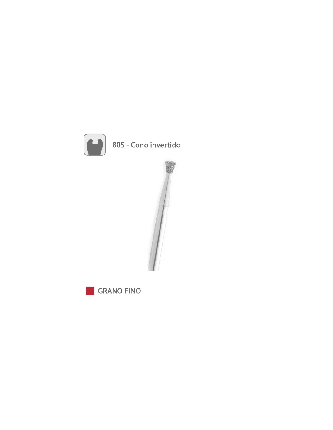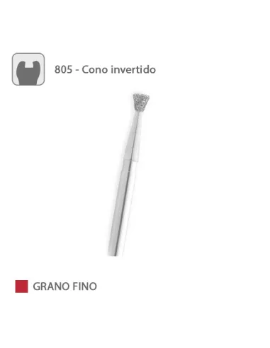 La fresa 805 de Medicaline es una fresa diamantada FG para turbina, con forma de cono invertido. El tamaño del grano es fino (color rojo). Existen 3 diámetros de cono diferentes.