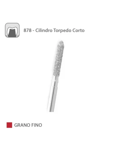 La fresa 878 de Medicaline es una fresa diamantada FG para turbina, con forma de cilindro torpedo.