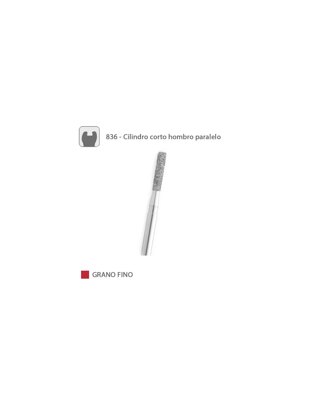 La fresa 836 de Medicaline es una fresa diamantada FG para turbina, con forma de cilindro corto hombro paralelo. El tamaño del grano es fino (color rojo). Existen 3 diámetros de cilindro diferentes.