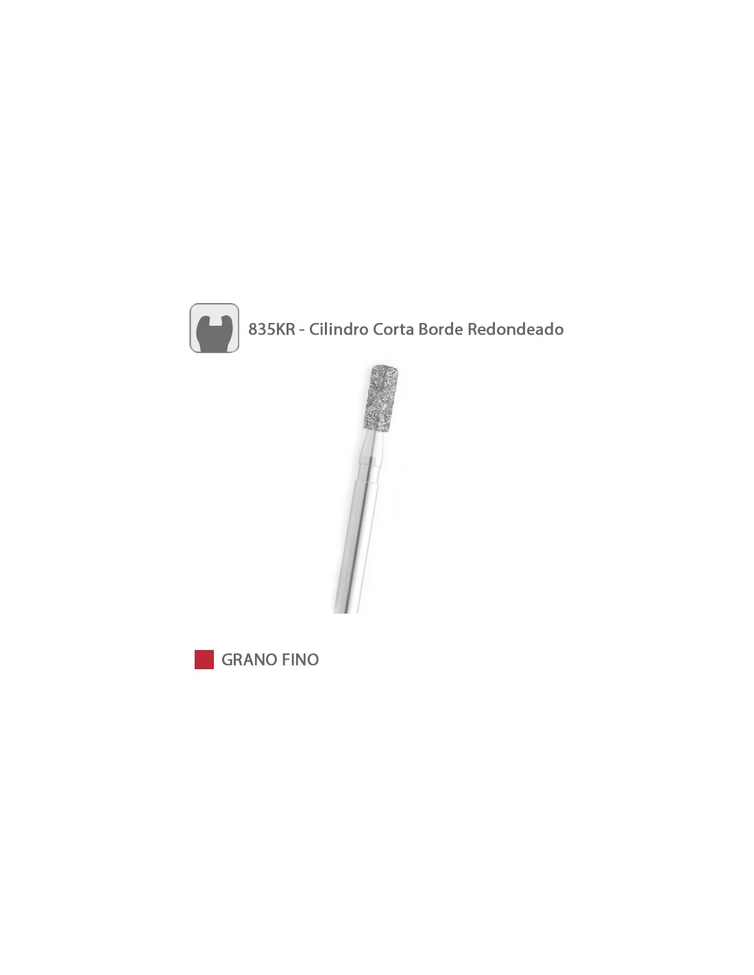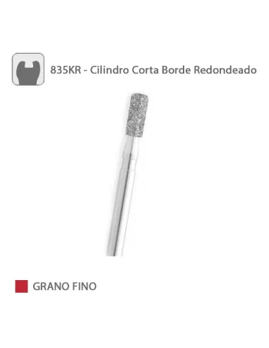 La fresa 835KRF de Medicaline es una fresa diamantada FG para turbina, con forma de cilindro corta-borde redondeado.