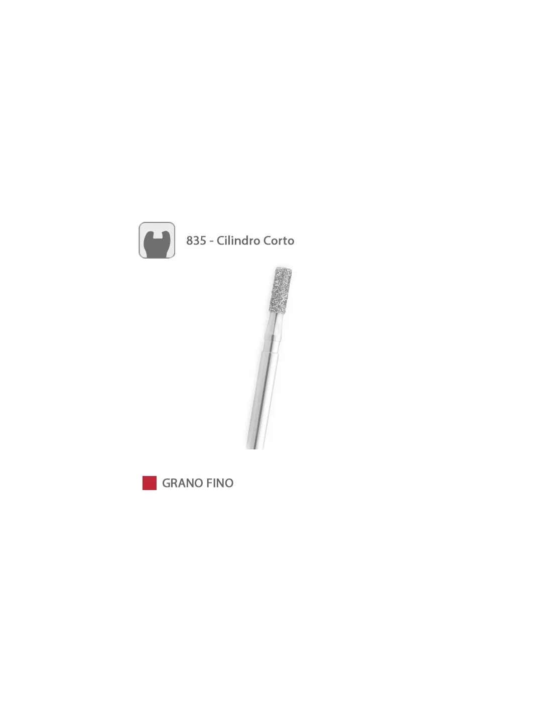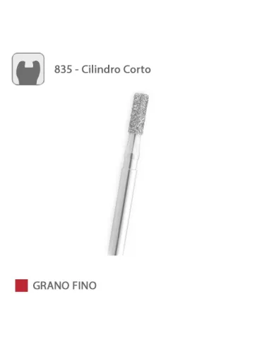 La fresa 835 de Medicaline es una fresa diamantada FG para turbina, con forma de cilindro corto. El tamaño del grano es fino (color rojo). Existen 3 diámetros de cilindro diferentes.
